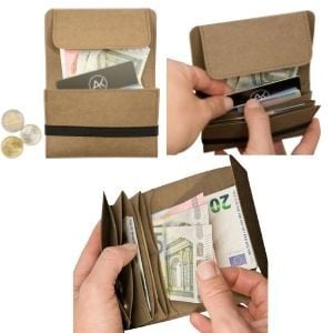 動物由来の原料を一切使用しないヴィーガンレザーを使いドイツ職人が手作りしている。また水や破れに強い加工が施されている。コンパクトなサイズ感と独特の風合いが楽しめる。